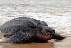 La plus grande des tortues marines, pouvant atteindre 2 mètres et 600 kg. Espèce prioritaire de conservation avec des pontes régulières sur nos côtes.